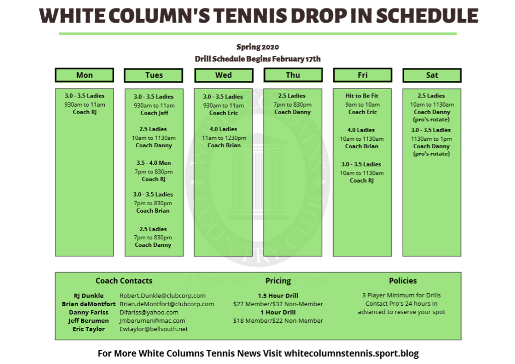 New Drill schedule is underway and will continue through the Spring Season. PDF can be downloaded on the side bar of the homepage under adult tennis.
